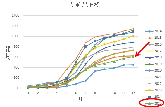 2025年の「釣果」は下のグラフの通り、10年振りレベルの結果でした💦